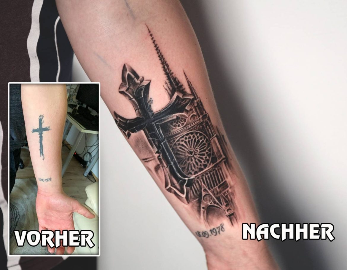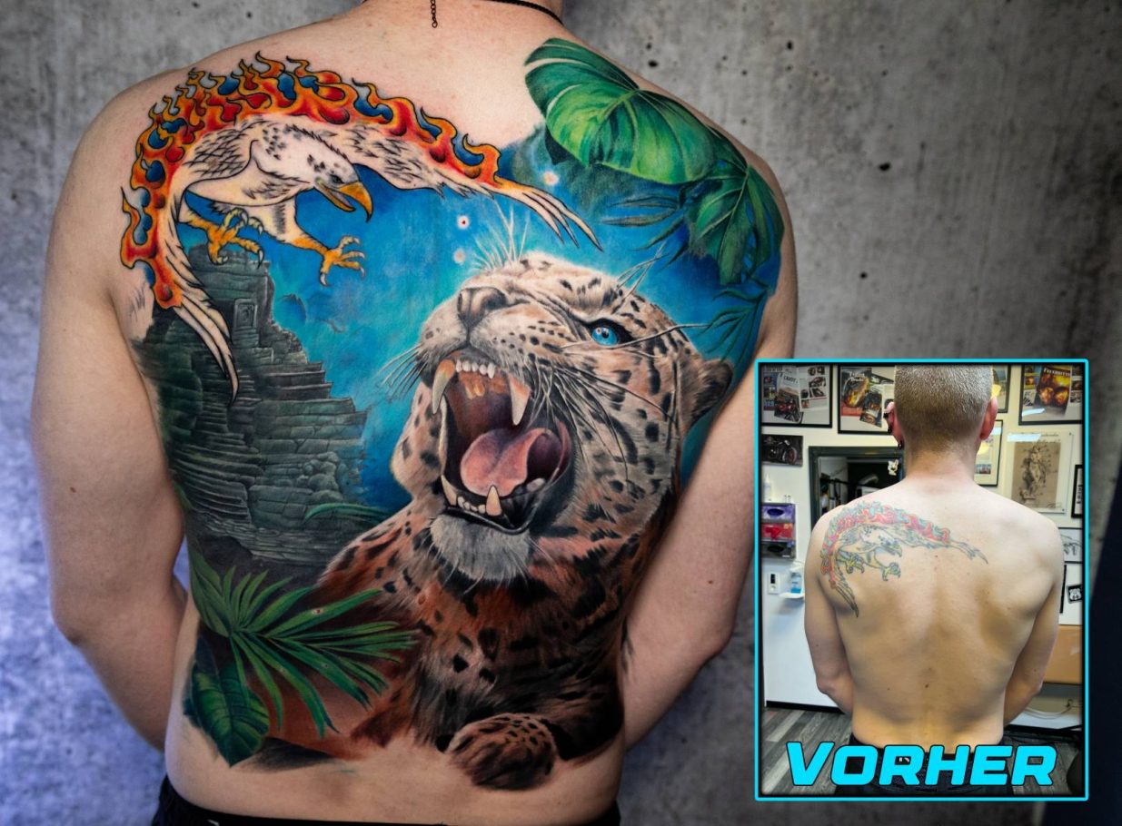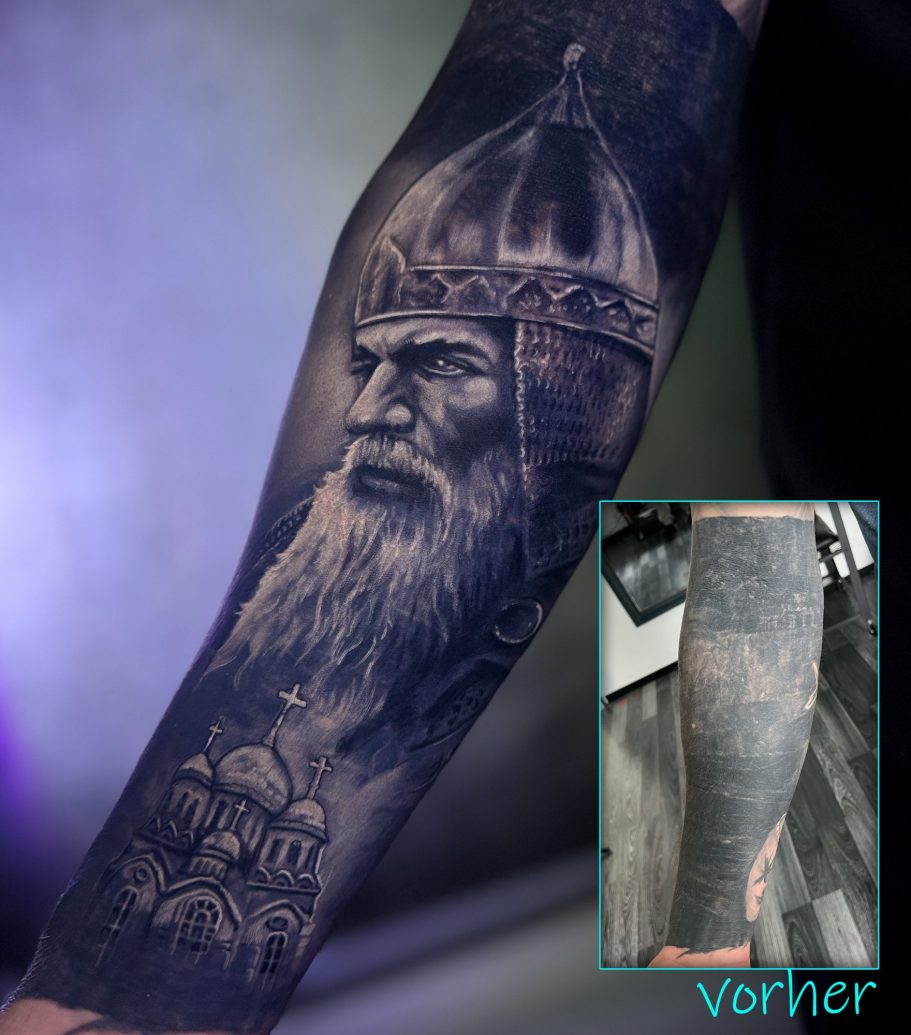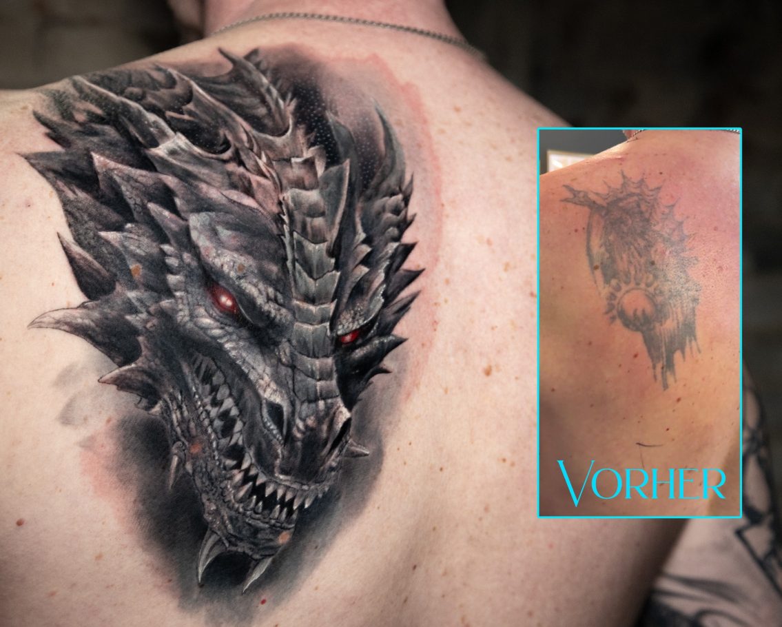 Allerdings lässt sich in den meisten Fällen auch ohne Lasern eine Lösung finden. Wenn man durch brainstormen ein Design im Vorfeld celver entwickelt und in das vorhandene Tattoo perfekt integriert, lassen sich manchmal Wunder verbringen. Man ist zwar hier eingeschränkt, im Sinne von altes großes Tattoo mit einem “filigrantem, halbtransparentem” Design abdecken. Da stößt man sicher an die Grenzen des machbaren. Allerdings wenn man offen ist für etwas größere Motive der Lösungswillen. Dann findet man auch eine Lösung.