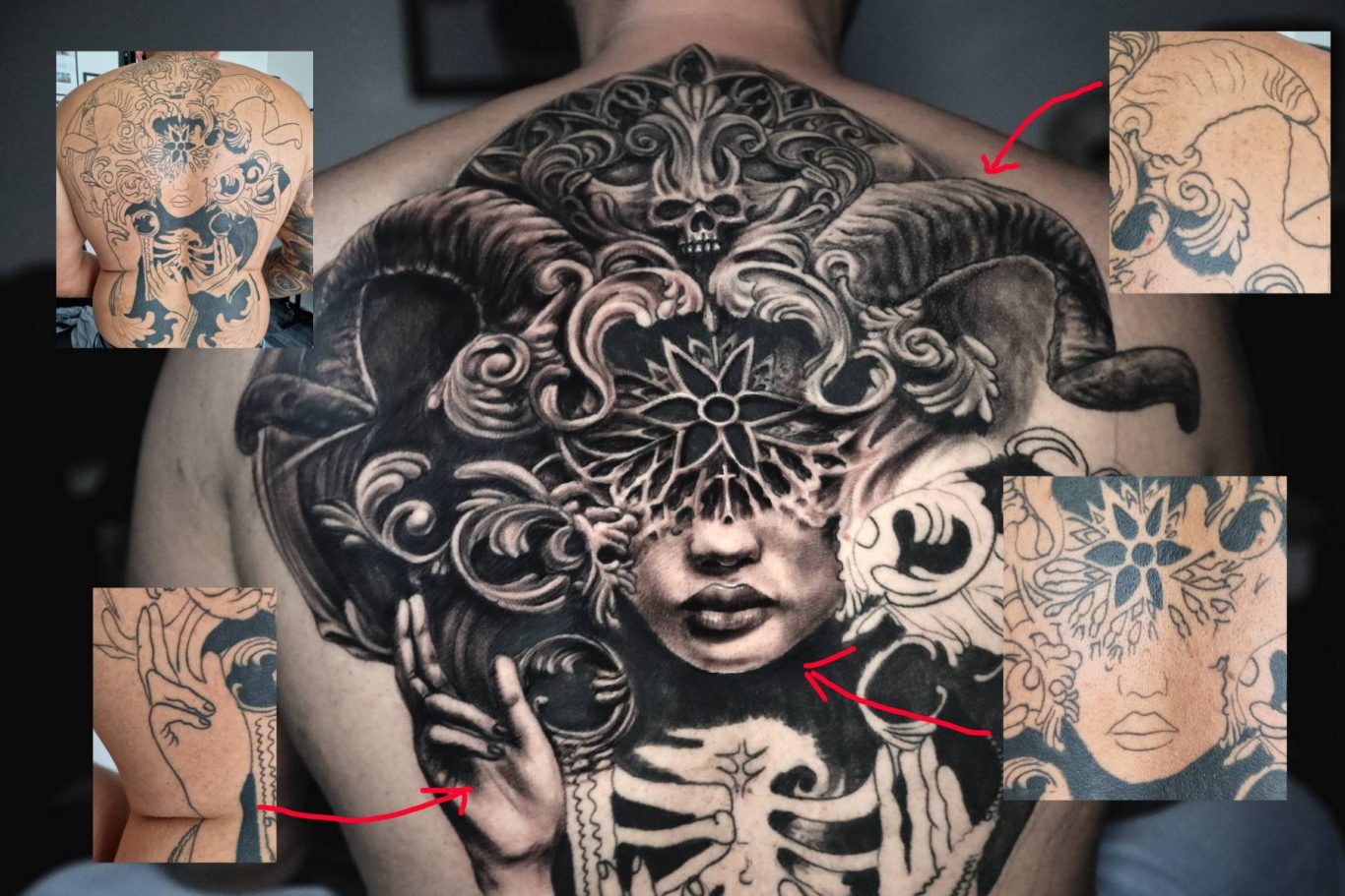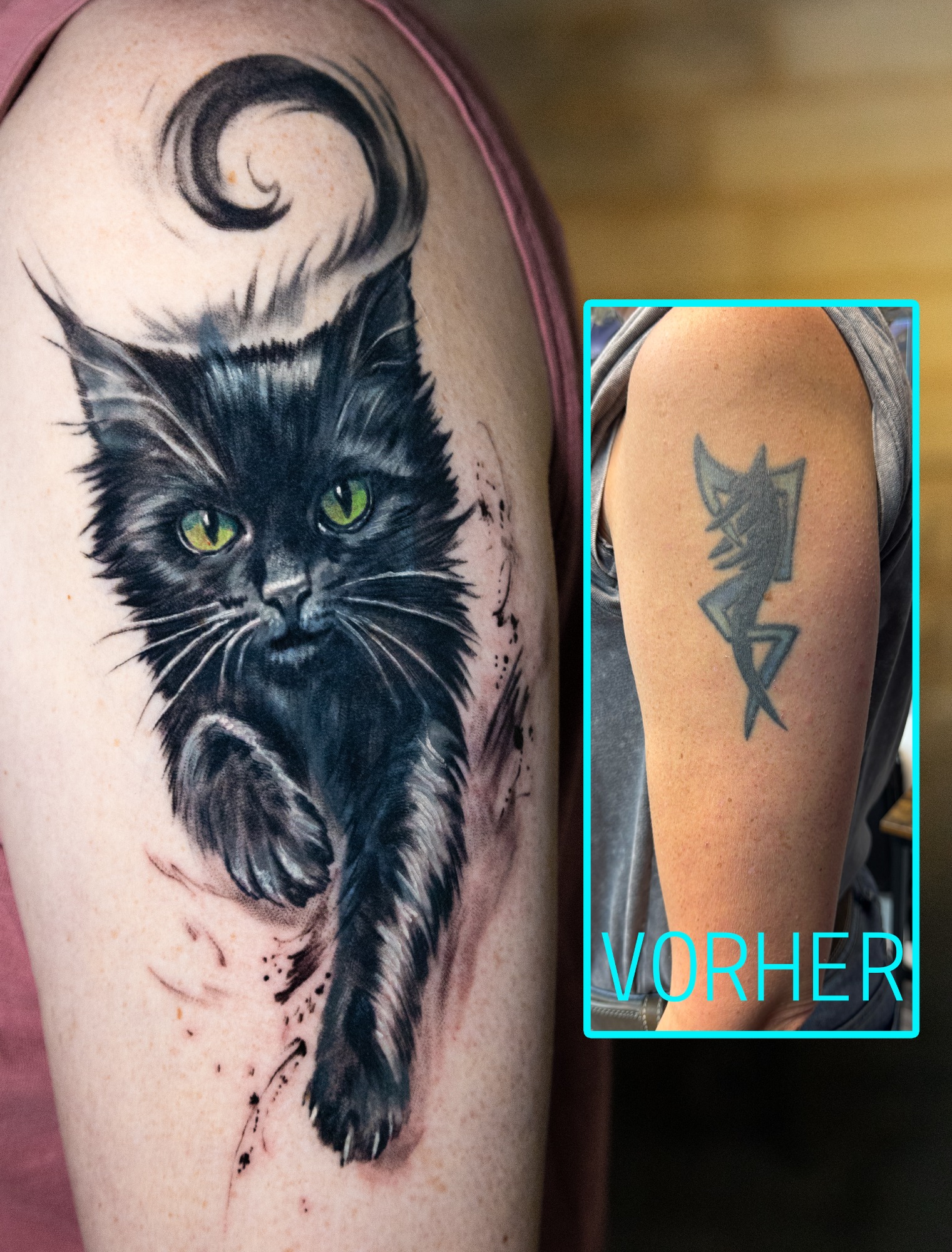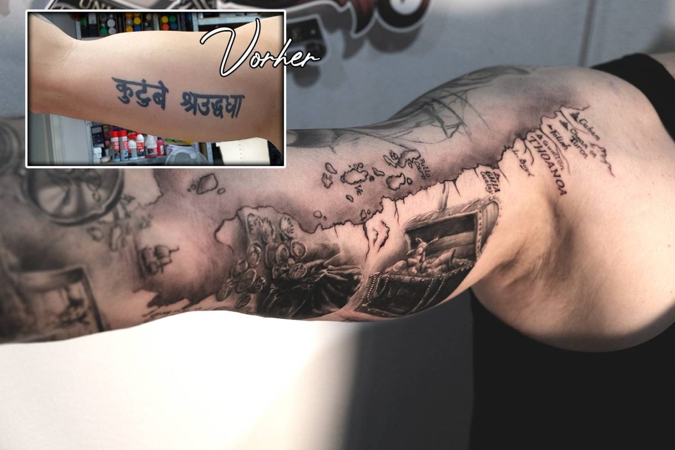 Allerdings lässt sich in den meisten Fällen auch ohne Lasern eine Lösung finden. Wenn man durch brainstormen ein Design im Vorfeld celver entwickelt und in das vorhandene Tattoo perfekt integriert, lassen sich manchmal Wunder verbringen. Man ist zwar hier eingeschränkt, im Sinne von altes großes Tattoo mit einem “filigrantem, halbtransparentem” Design abdecken. Da stößt man sicher an die Grenzen des machbaren. Allerdings wenn man offen ist für etwas größere Motive der Lösungswillen. Dann findet man auch eine Lösung.